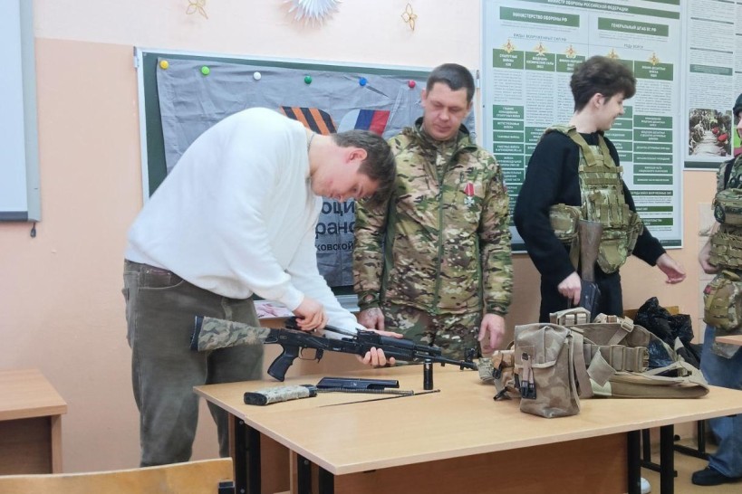 Урок мужества в Чулковской школе №20 провел представитель Ассоциации ветеранов СВО Раменского муниципального округа Василий Медведев вместе с членом актива организации Максимом Рогожиным.