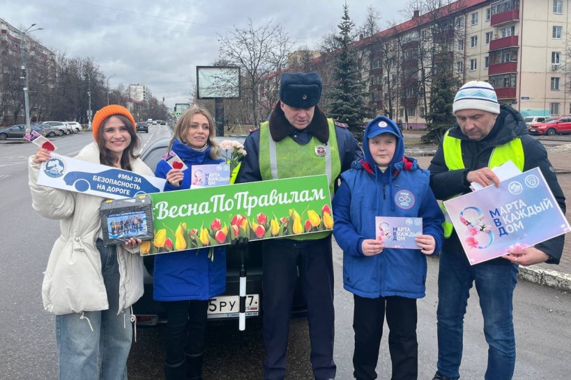 В Раменском прошла ежегодная акция по поздравлению автоледи с Международным женским днем 8 Марта. Сотрудники ГАИ, юидовцы и волонтеры останавливали женщин за рулем и дарили им цветы и световозвращающие сувениры.